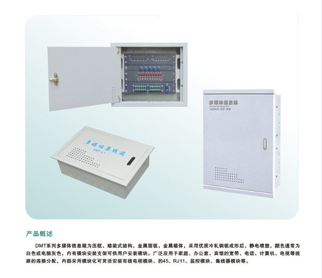 1、多媒體網(wǎng)絡(luò)寬帶箱箱體采用優(yōu)zhi冷軋鋼板,表面噴塑處理。